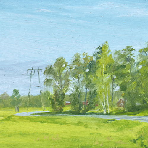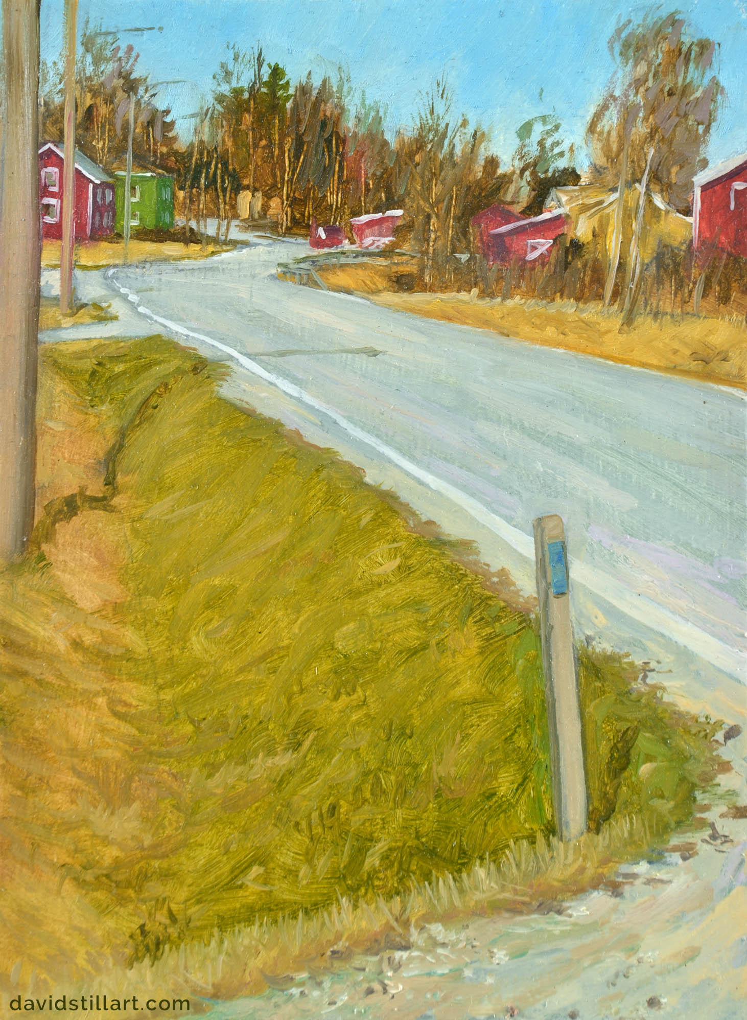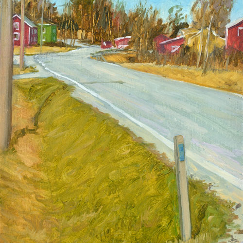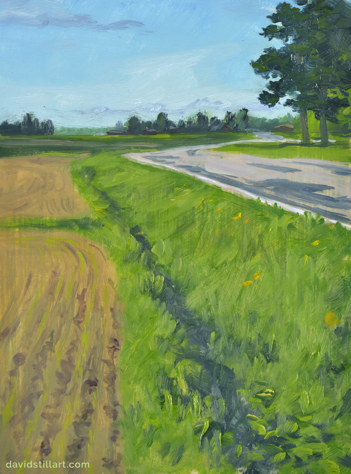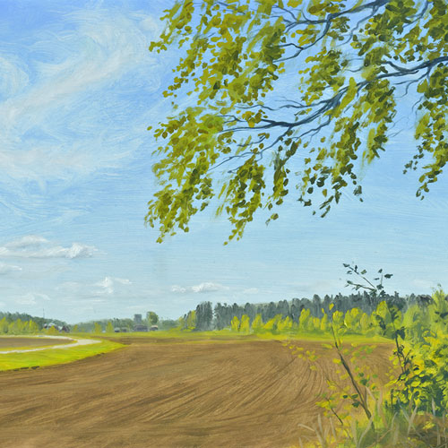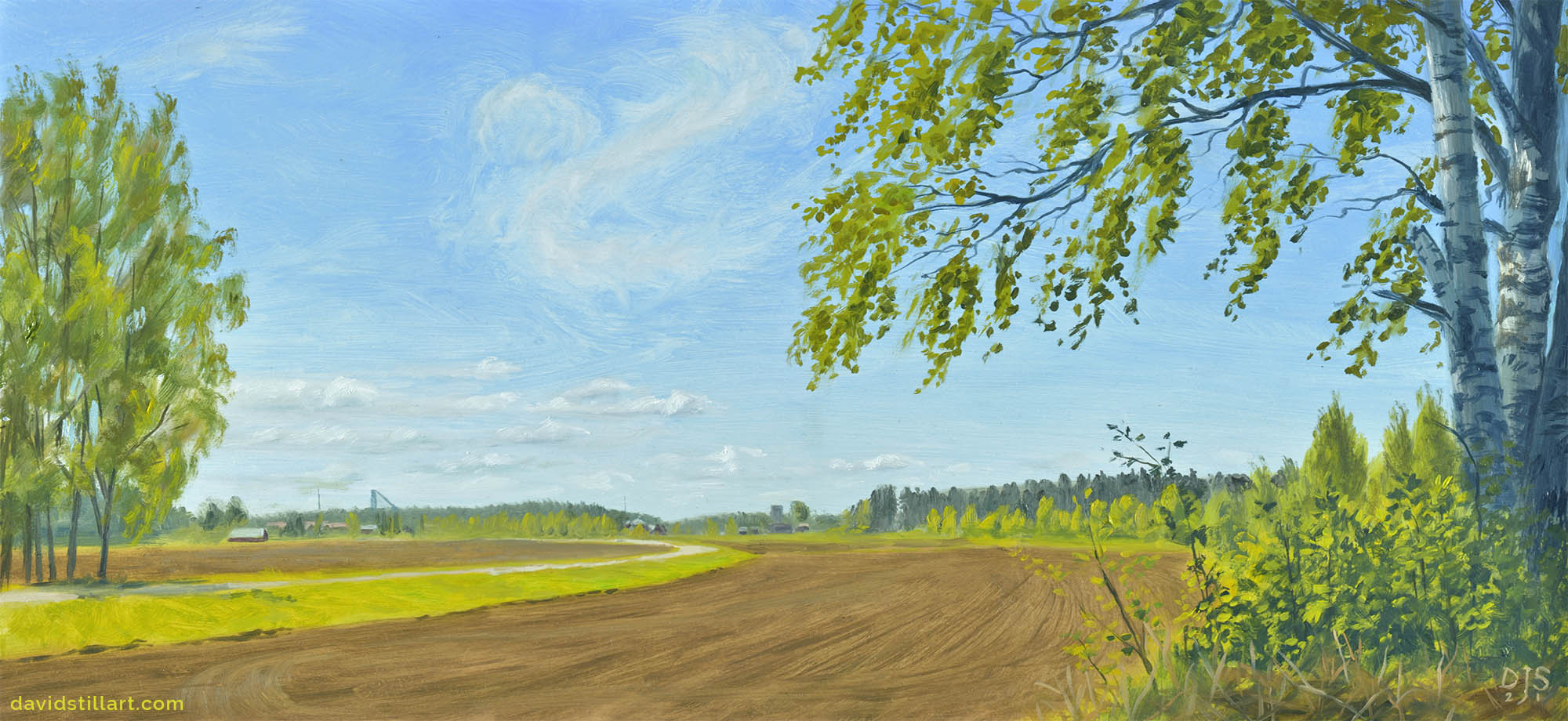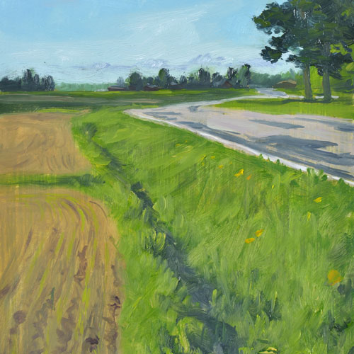 A series of landscapes painted along Vöråvägen in Finland. Each picture includes the place where I was standing when painting the next picture.